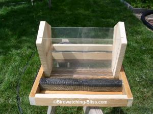 This plan also uses a new idea to help keep the bird seed and the tray dry. Instead of using a solid wood or plywood bottom to the tray, we use fiberglass screen material (just like the screens on your doors and windows).